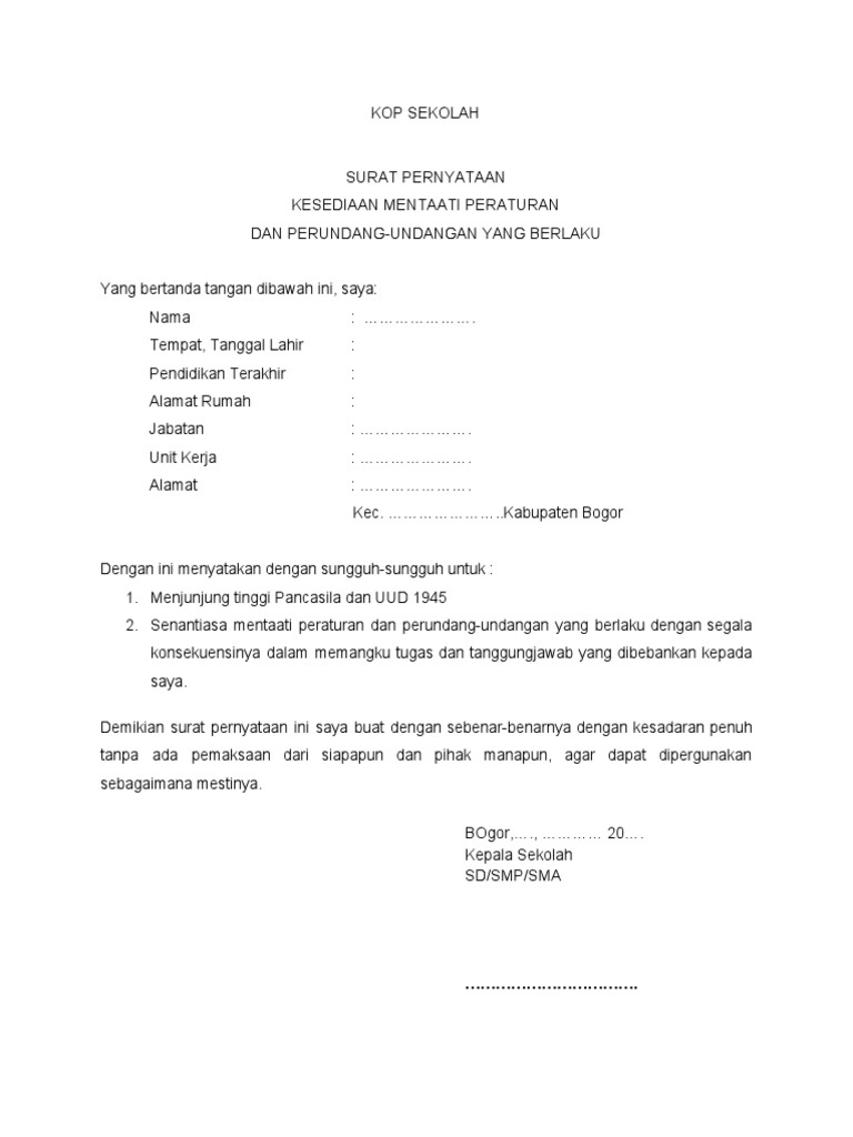 Contoh Surat Pernyataan Kesanggupan Mematuhi Peraturan Bagi Contoh Surat from 0.academia-photos.com Surat pernyataan merupakan salah satu surat yang umum digunakan untuk berbagai macam hal. Besar harapan saya agar saya tidak dikeluarkan dari sekolah. Ada berbagai contoh surat undangan dengan berbagai jenis kegiatan seperti surat undangan rapat, pernikahan, reuni, dan sebagainya. Surat pernyataan adalah surat yang dibuat untuk menyatakan bahwa seseorang telah atau tidak pernah melakukan suatu hal. Beberapa instansi membuat peraturan apakah surat pernyataan tersebut harus ditulis dengan tangan atau tidak. Penutup surat pernyataan yang terdiri dari: Setelah beberapa waktu lalu kita belajar mengenai contoh surat resmi, dan surat pernyataan sendiri memiliki beberapa jenis, seperti surat pernyataan kerja, surat pernyataan kesanggupan, surat pernyataan belum menikah. Ada banyak contoh surat pernyataan, yang terpenting dari sebuah surat pernyataan yakni mengenai isi dan tujuan dari isi surat tersebut.